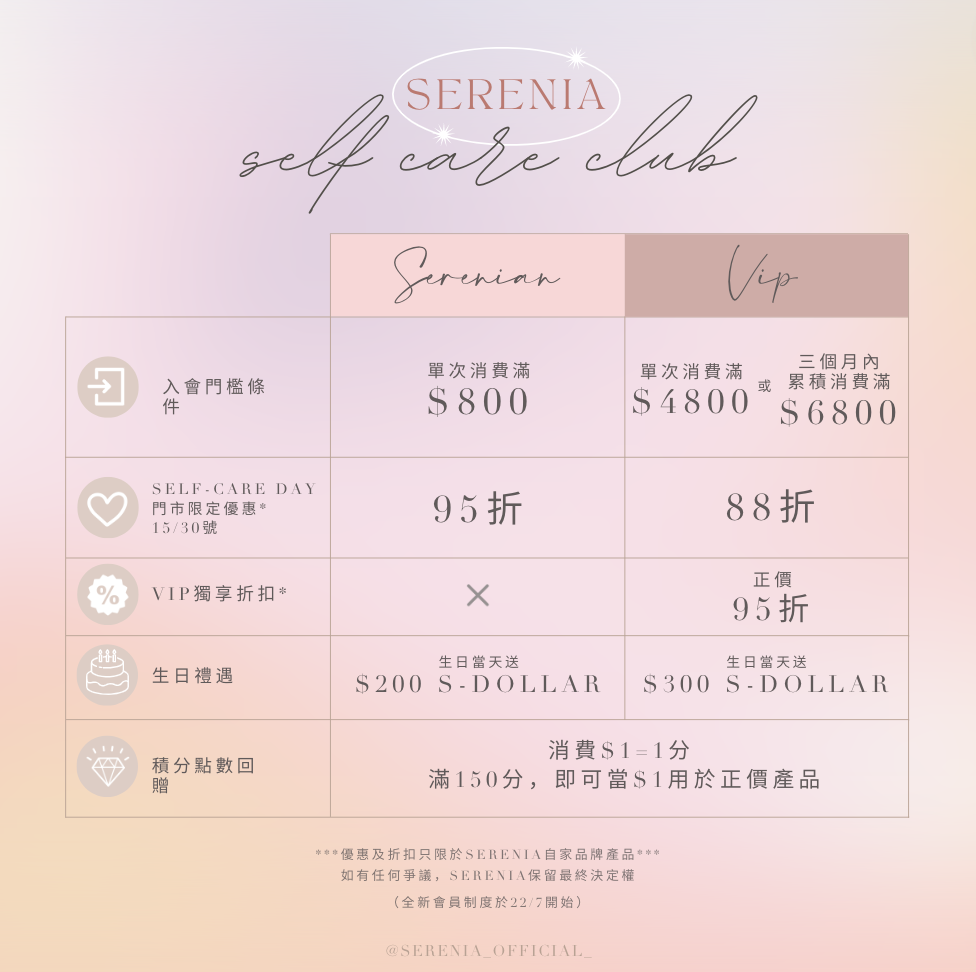 4. SERENIA保留任何更改會員計劃之條款和細則,不會作另行通知。