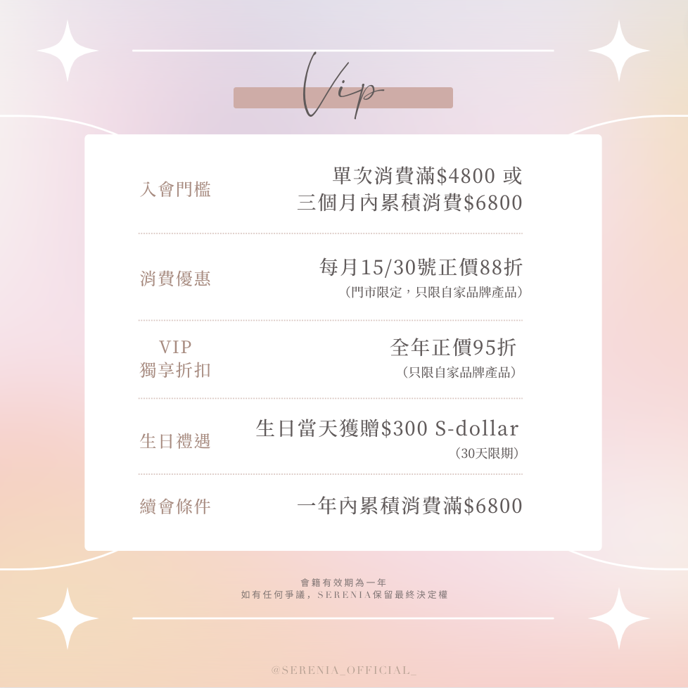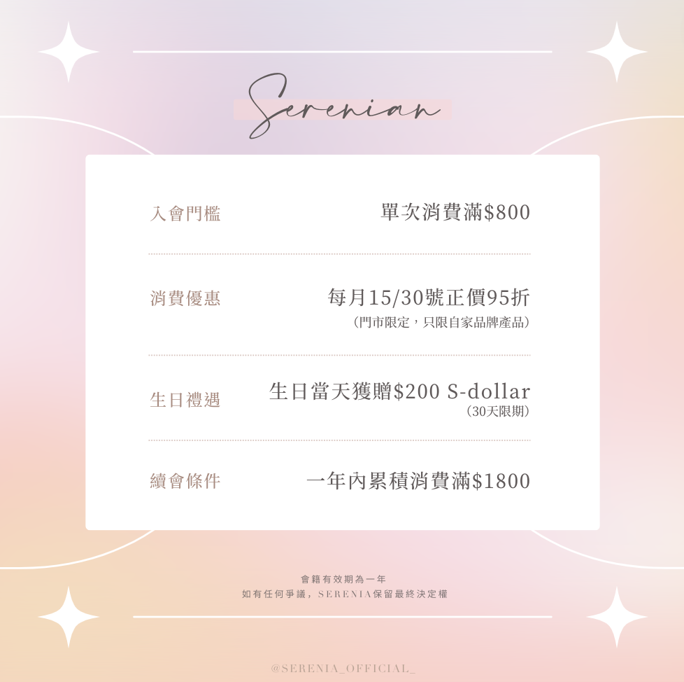 1. SERENIA會員會藉有效期為一年;