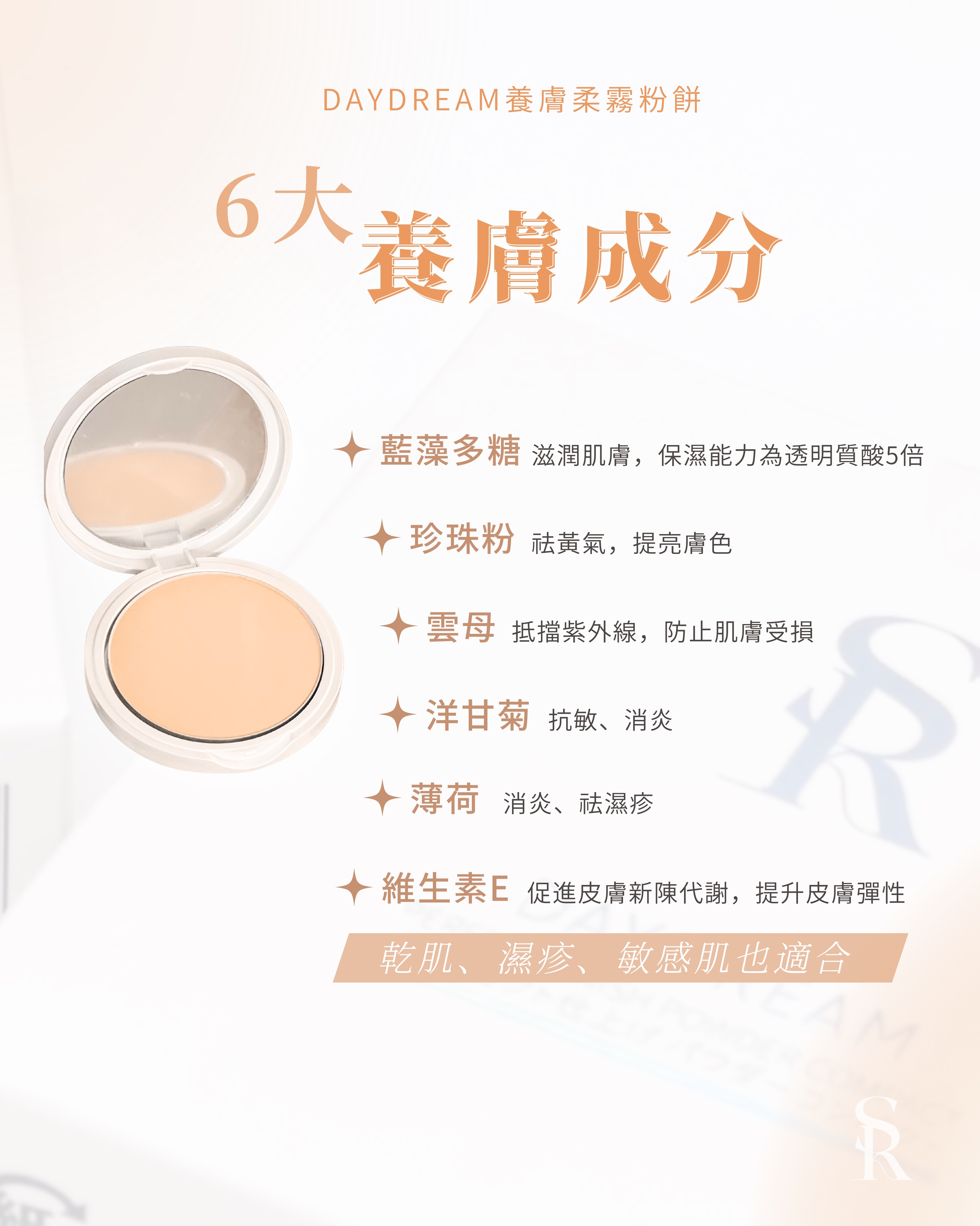 ‣ 洋甘菊、薄荷、珍珠粉、雲母、藍藻多糖、維生素E