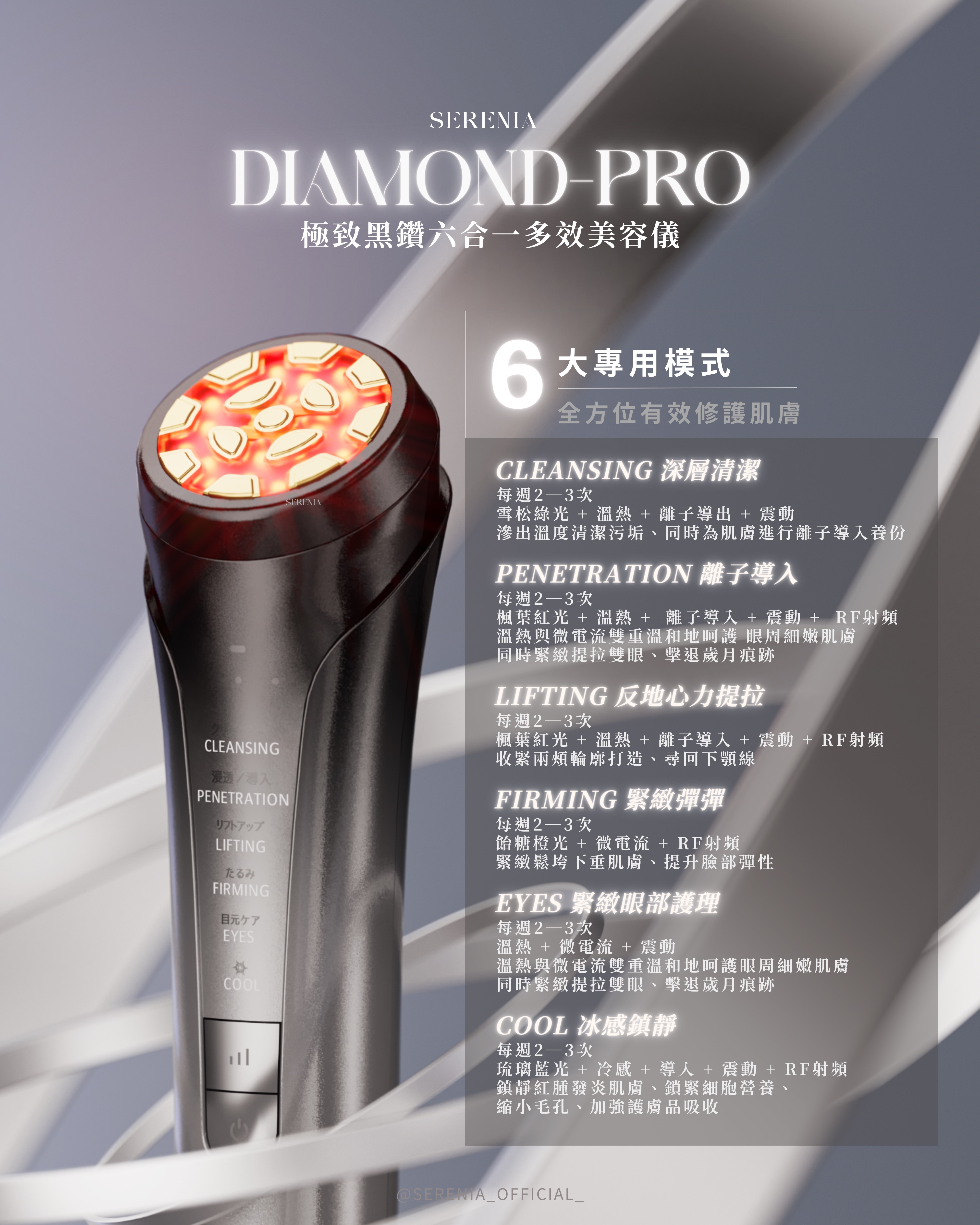 六種模式、五大功能、四重彩光、三等強度、兩款面膜、一機多效