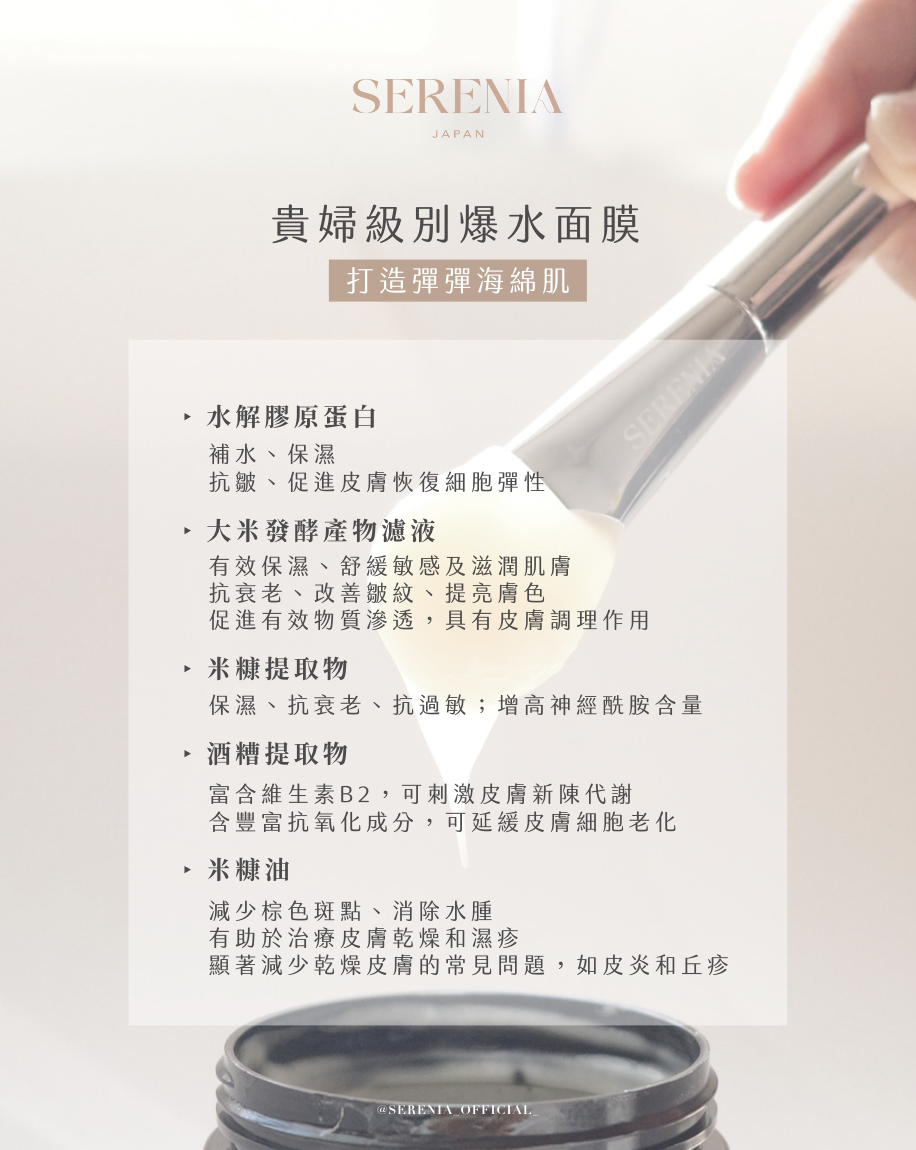 ‣ 水解膠原蛋白、大米發酵產物濾液、米糠提取物、米糠油、酒糟提取物
