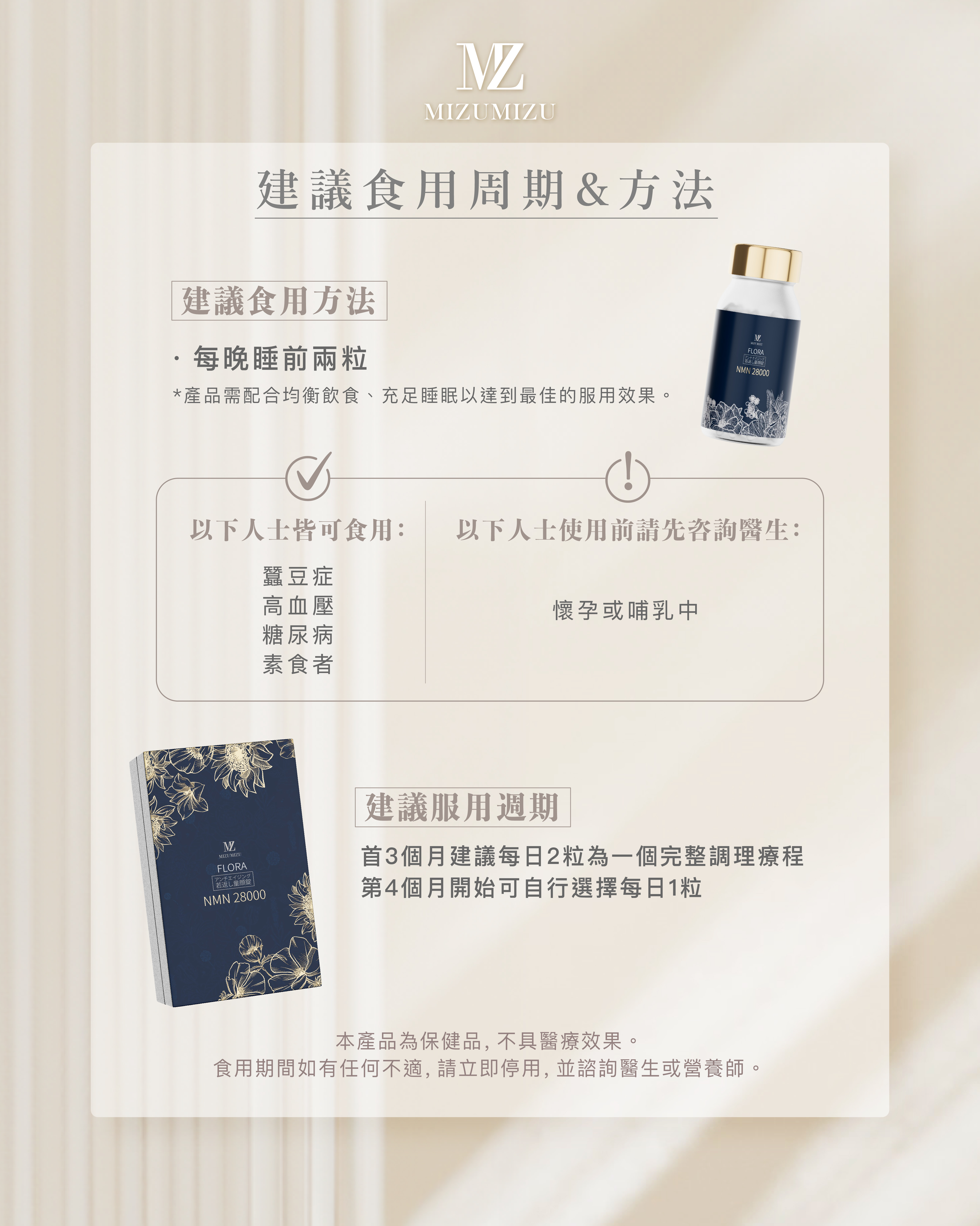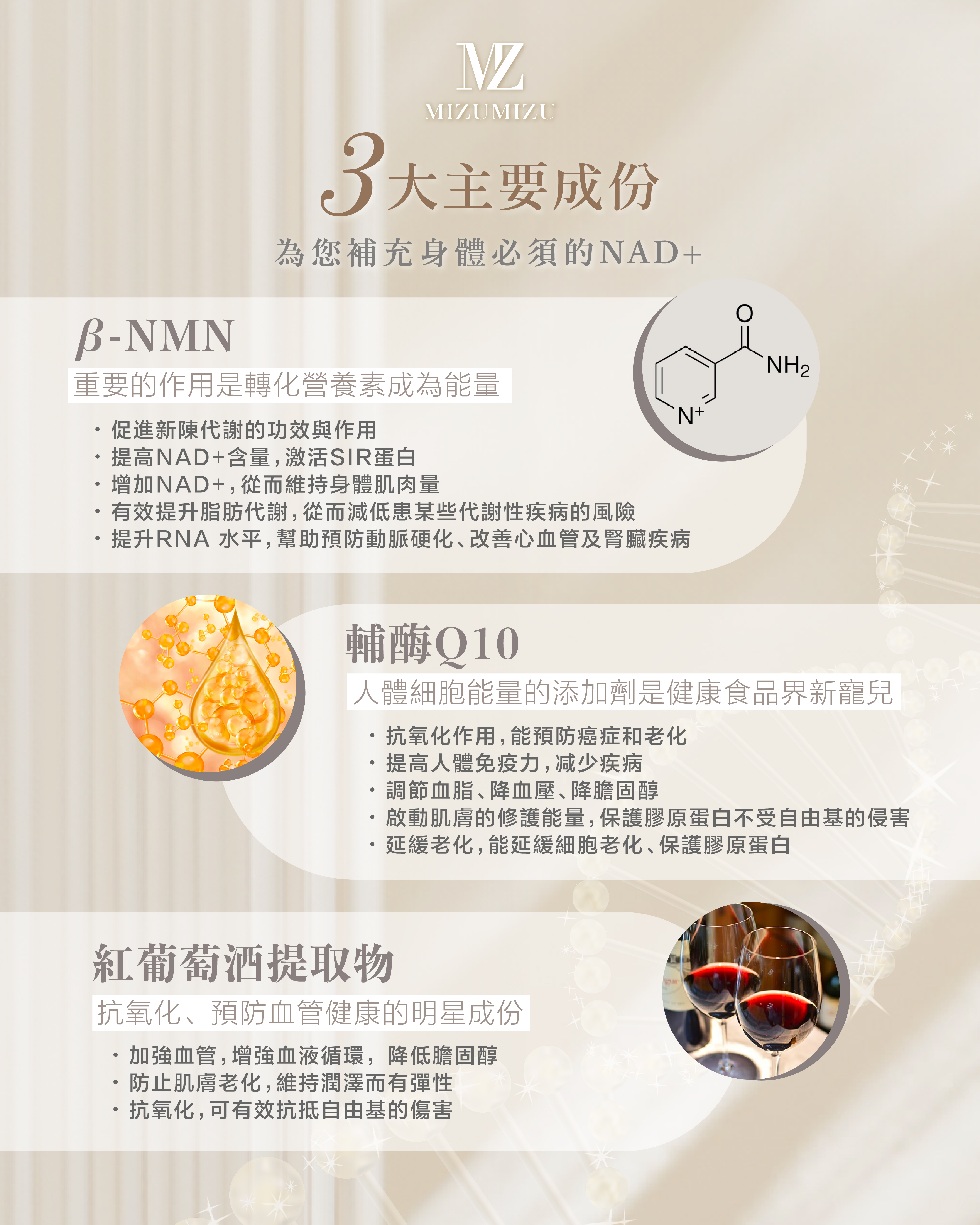 ✦ 主要成份:β-NMN、輔酶Q10、紅酒提取物、透明質酸