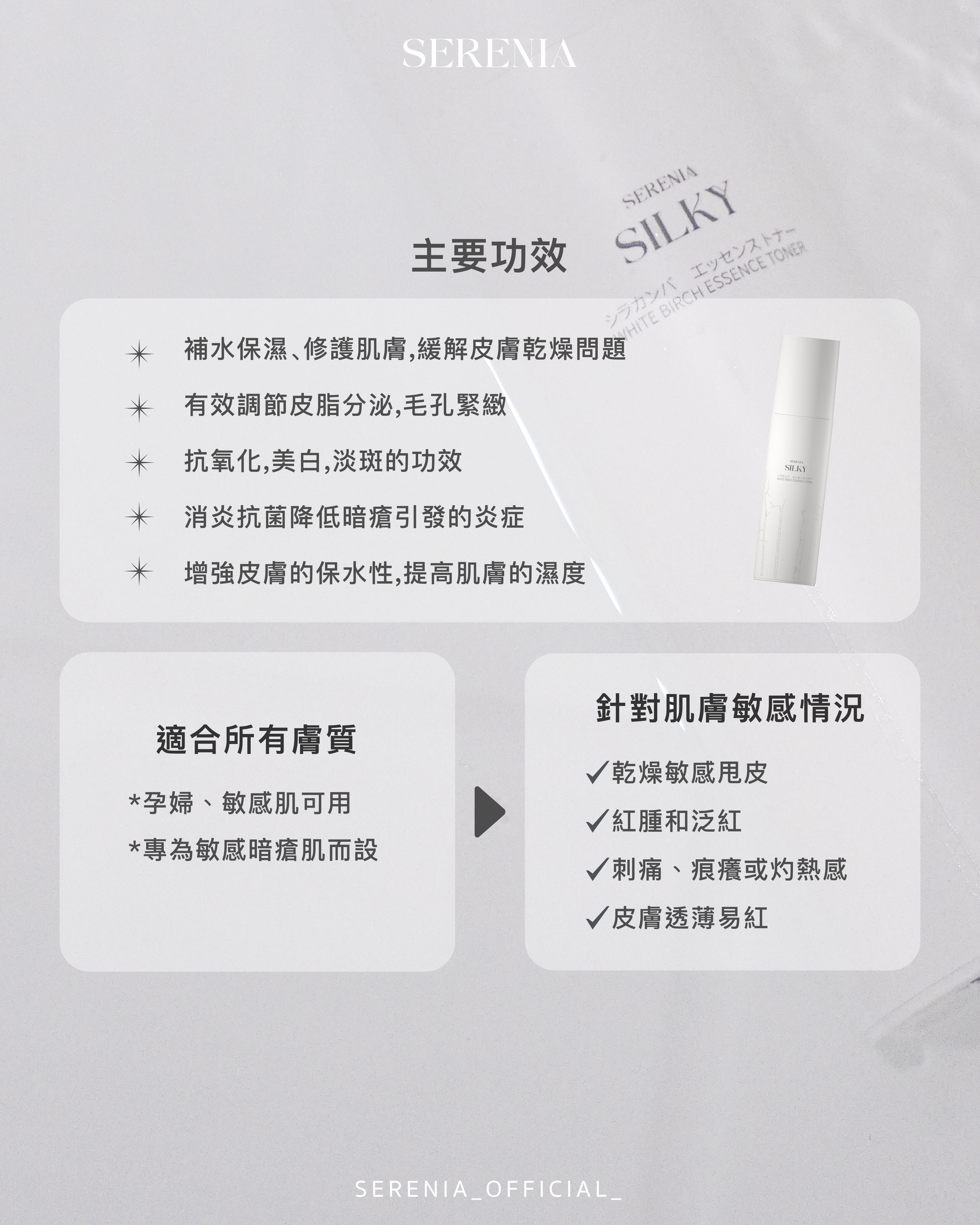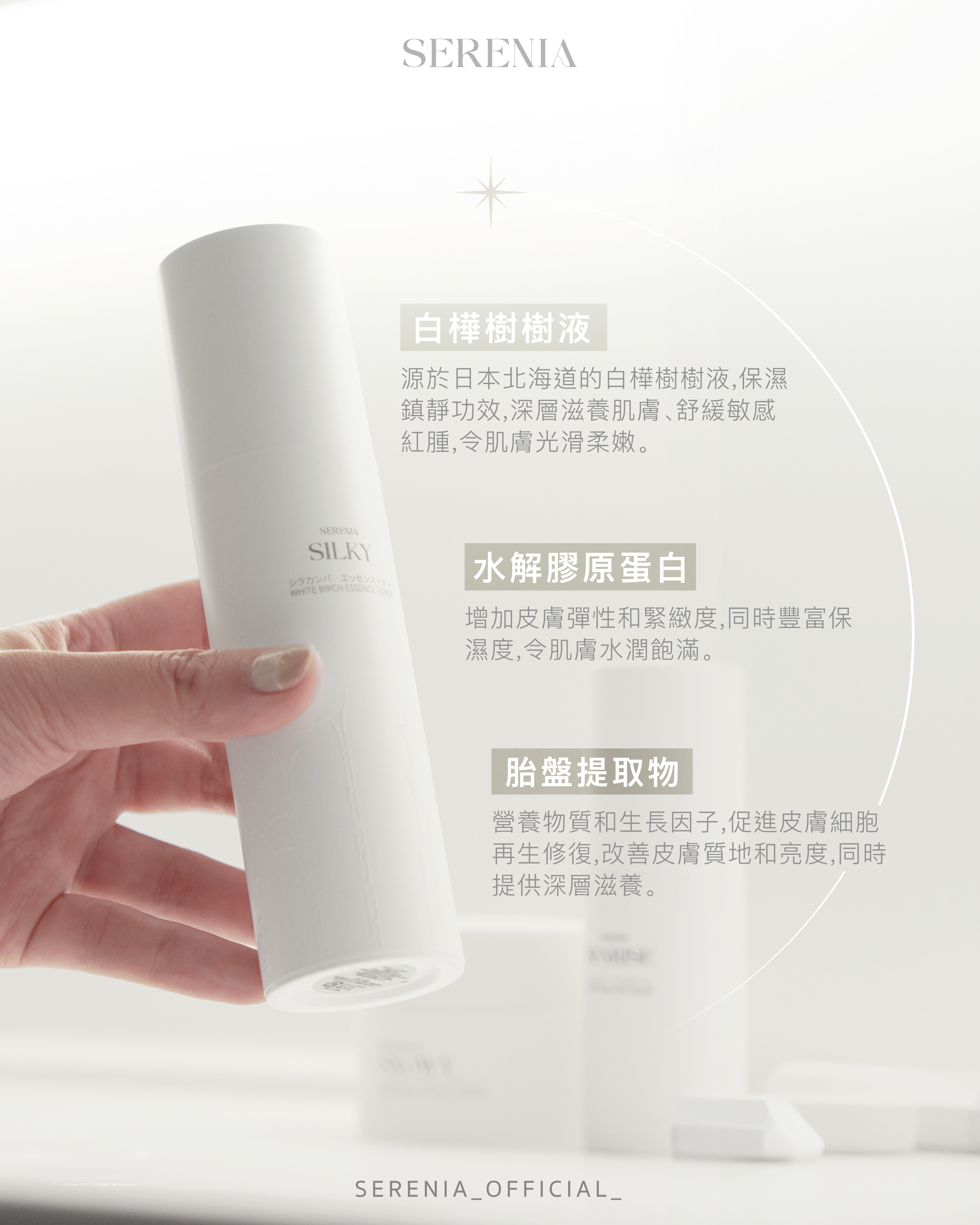 ‣ 白樺樹樹液、甘草酸二鉀、水解膠原蛋白、胎盤提取物、醣基海藻糖、水溶性維他命C(MAP)、黃原膠、雪蓮花提取物、神經酰胺、玫瑰果提取物、蘆薈葉提取物